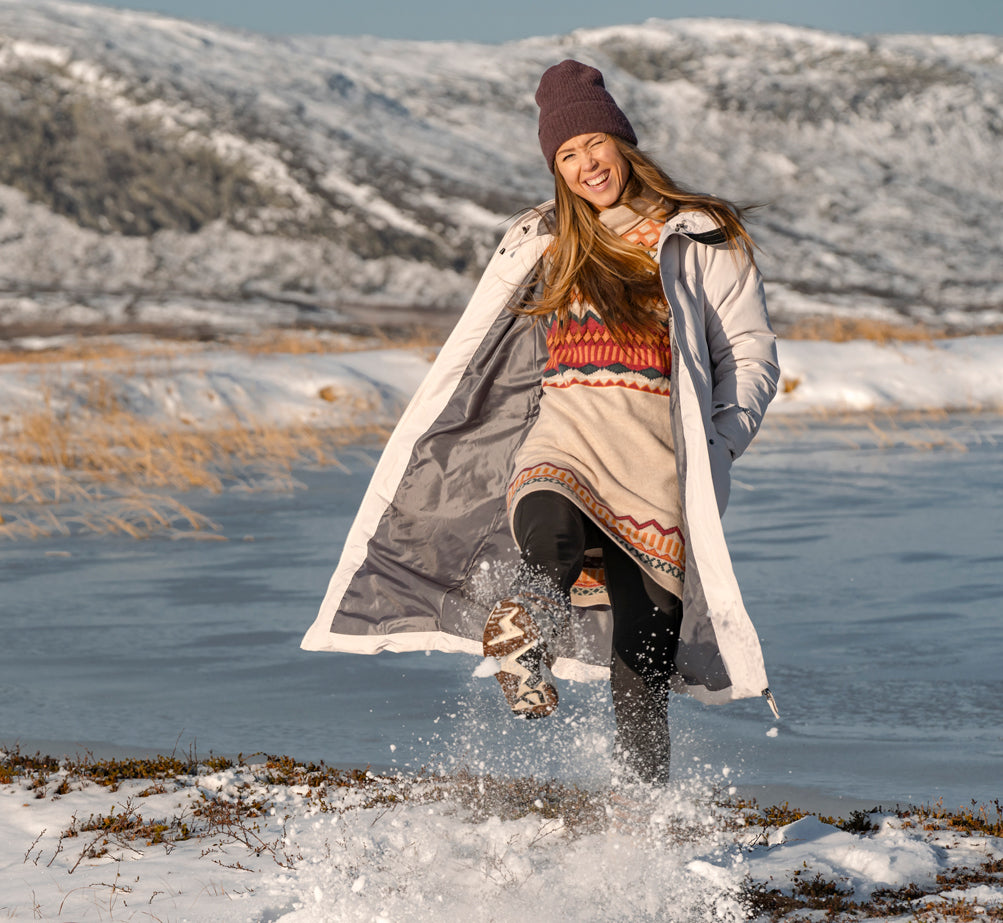 En stickad klänning eller tunika med mönster i färger som påminner om en vacker solnedgång. Plagget finns även i en vacker gråskala. Tunikan har en hög härlig krage som värmer skönt. Allt funkar ju till jeans – och även denna tunika är härlig till favoritjeansen men funkar även bra till tights och sköna boots.