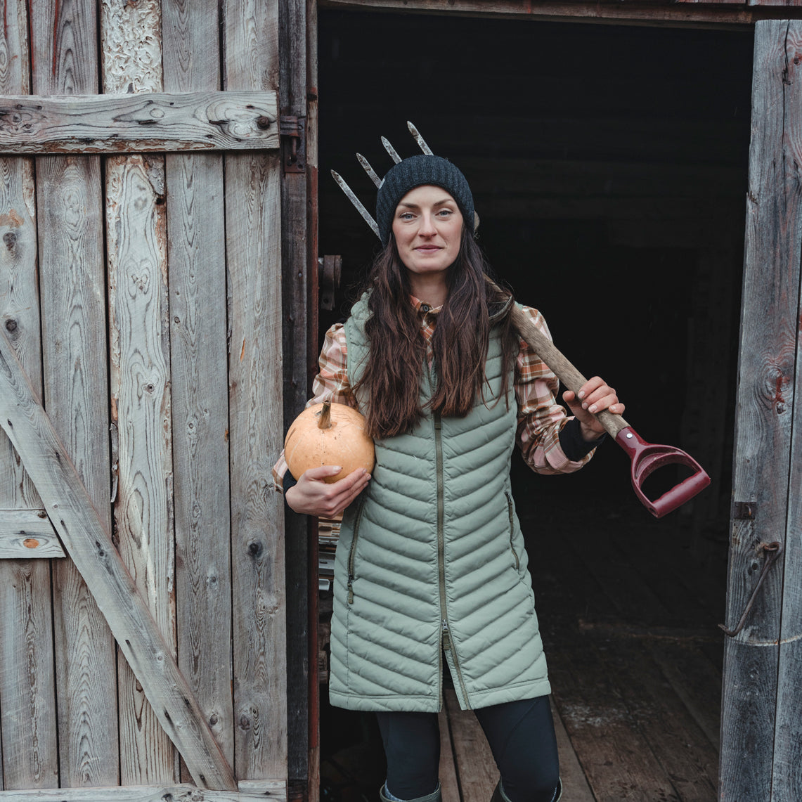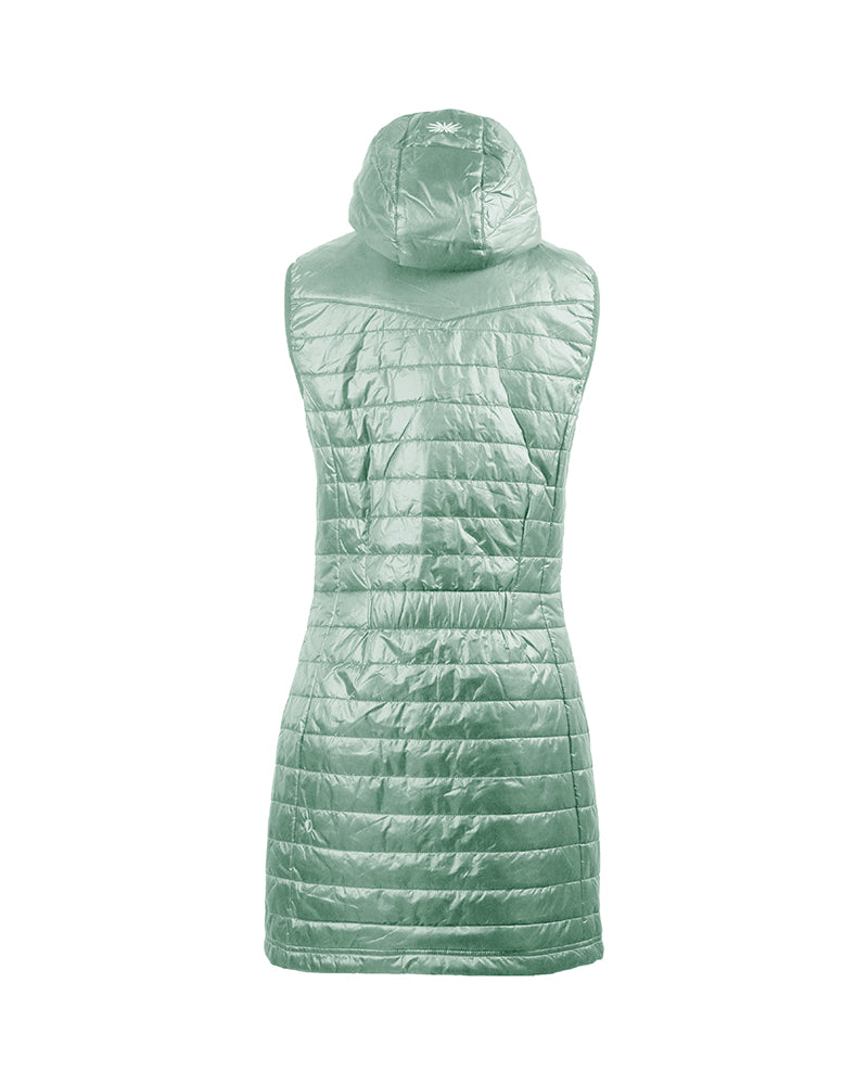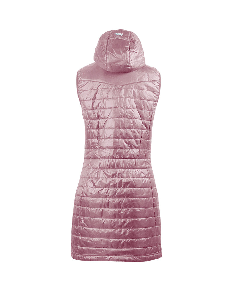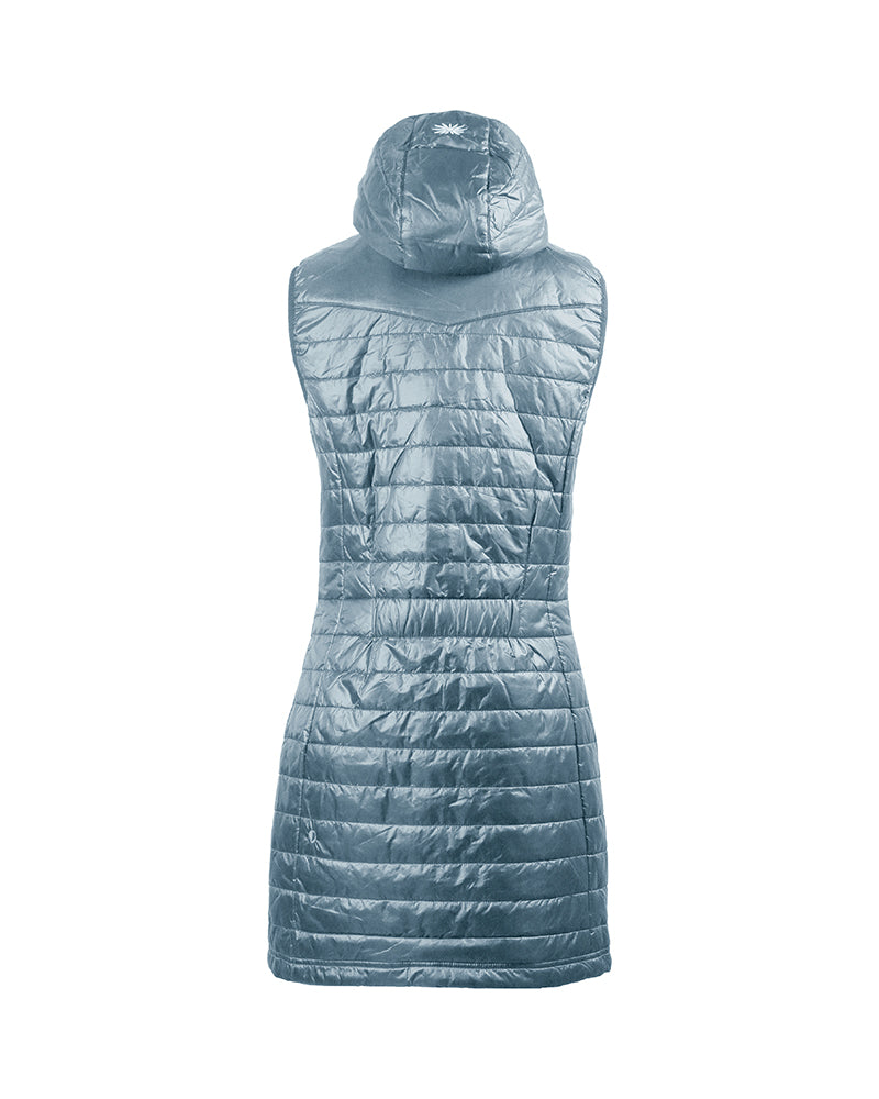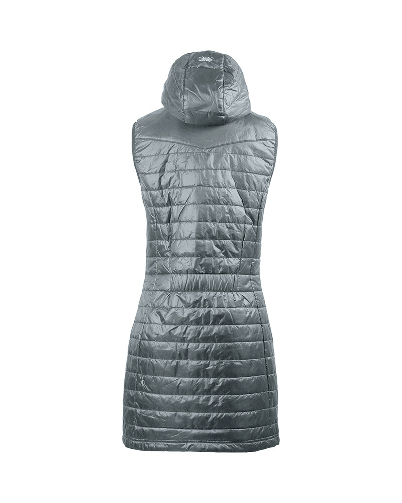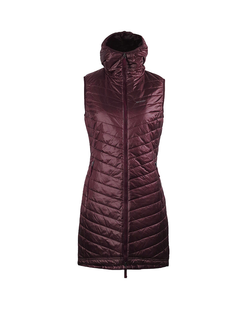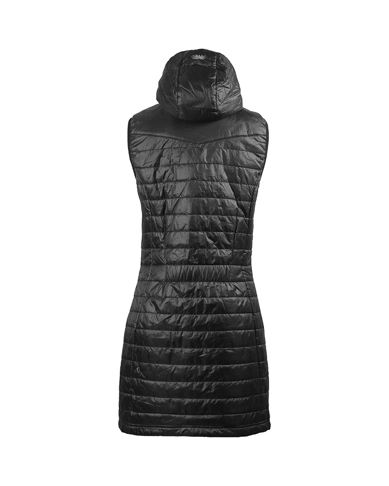 En lång värmande väst som täcker både rumpa och rygg. Perfekt både under skalplagg som värmande foder eller som den är! Tight huva och figurnära passform. Vill du ha västen som ytterplagg finns det 2 handfickor framtill med dragkedjor för förvaring eller för att värma kalla händer.