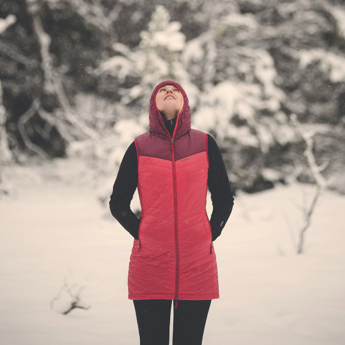En av våra bästsäljande västar - The Debbie - kommer nu i en tvåfärgad variant. Tight huva och figurnära passform. Vill du ha västen som ytterplagg finns det 2 handfickor framtill med dragkedjor för förvaring eller för att värma kalla händer.